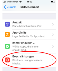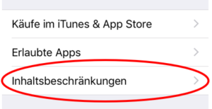 Anschließend wird der Menüpunkt „Beschränkungen“ gewählt: