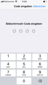 Eltern müssen den PIN für die Einstellungen eingeben (sogenannter „Bildschirmzeit-Code“). Wurde dieser noch nicht erstellt, muss der PIN erst erstellt werden.